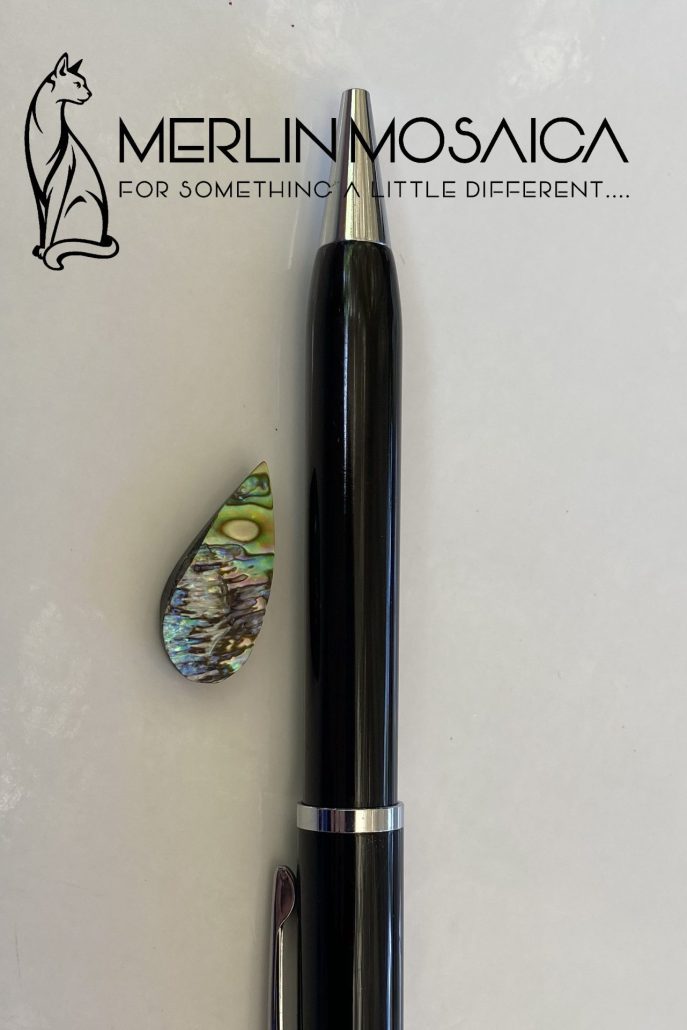 - Paua (abalone) shell set on a black base. Teardrop shape.