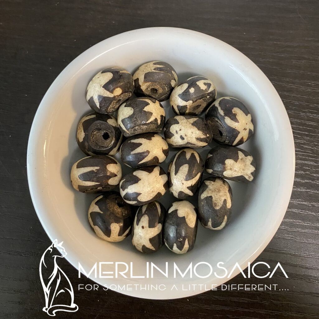 Beautiful large bone batik from Africa that have been hand dyed. The dying method is known as “batik”, which is a wax relief process. The design on these is an interesting “STAR” design, with the pattern going all the way around the bead. Due to the handmade nature of these beads some beads may have a wood core that is more secure than others.