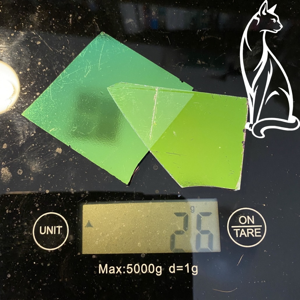 This glass is very expensive, but you don’t need very much to add some pizzazz to your work. It is priced by the gram, and the clear is more expensive than the black. Packs contain 1-2 pieces, dependant on weight. I’ve tried to keep the packs around the 20 gram size.