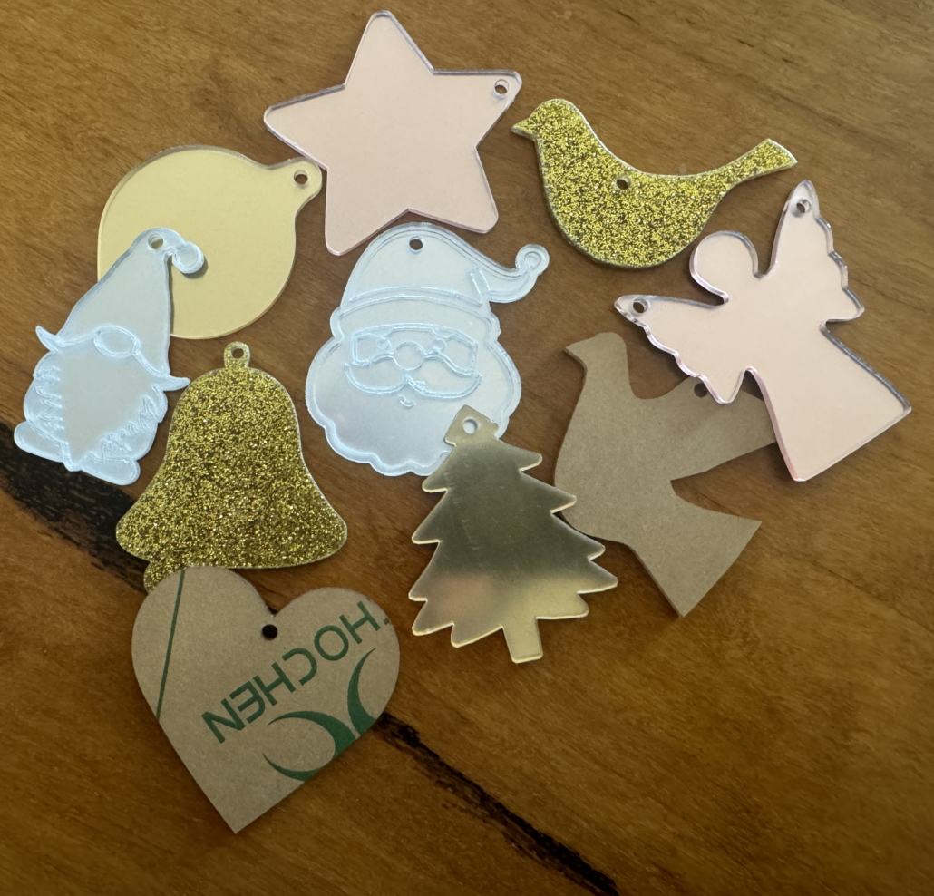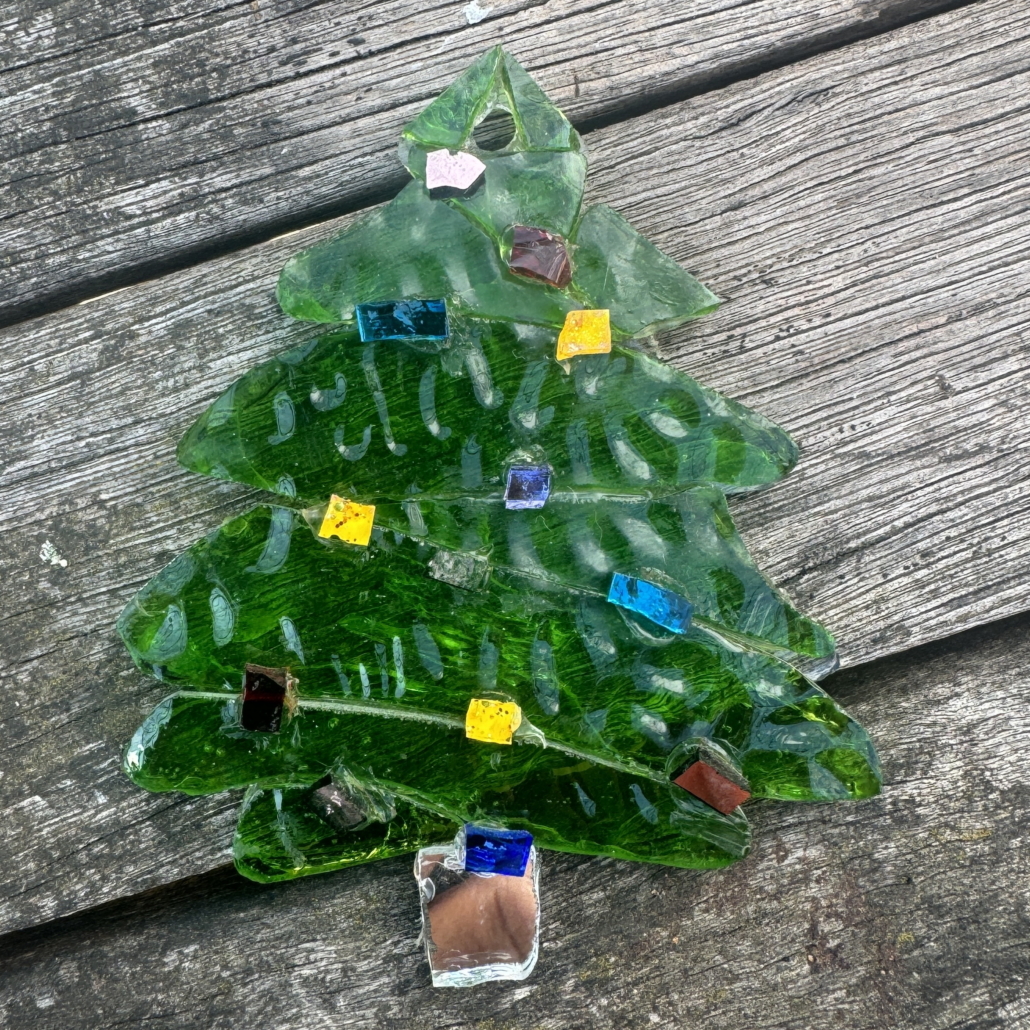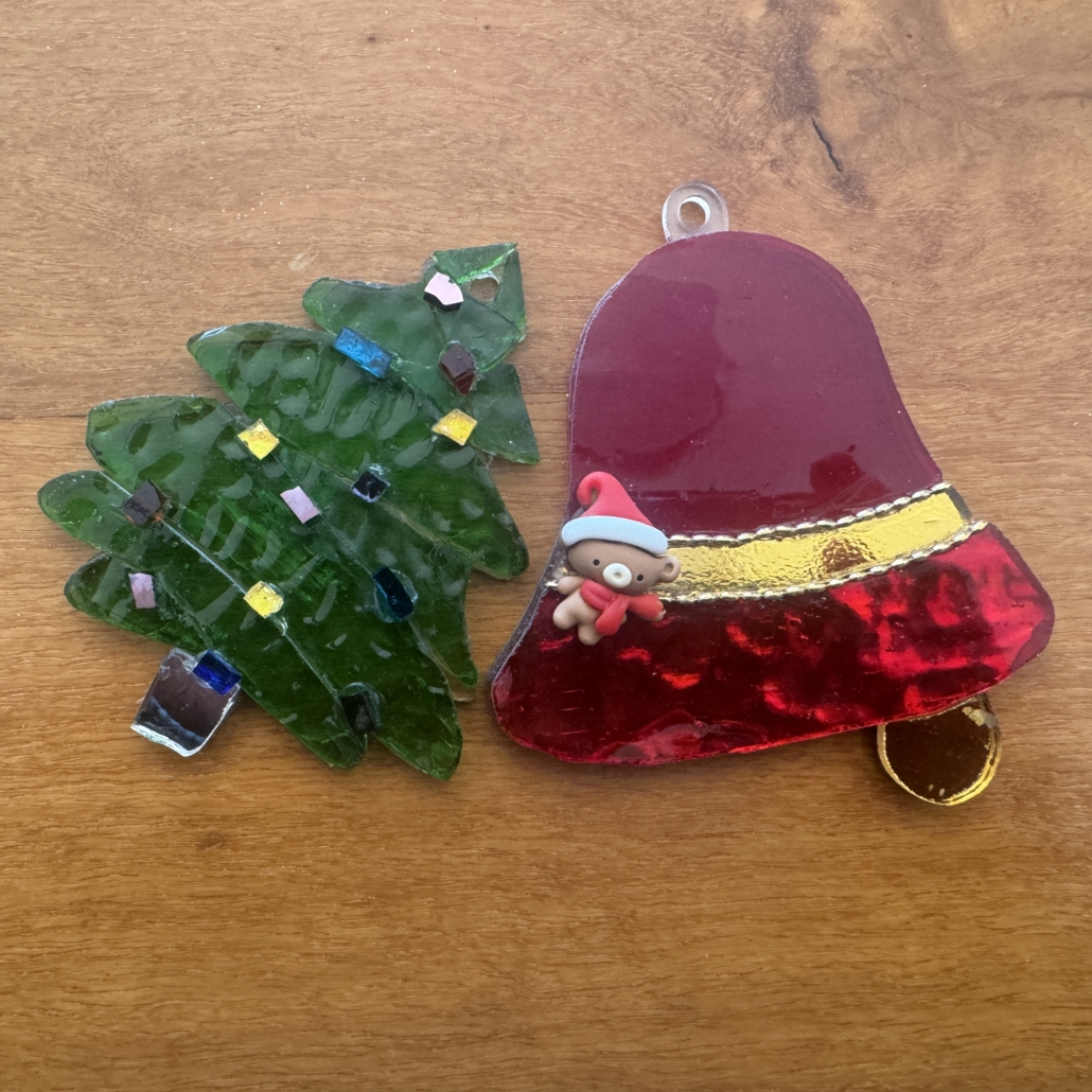10 Christmas themed pieces, 75mm or 100mm high. String them on some tinsel and festoon your windows, doorways or Christmas tree. Suitable for exterior use, they can be strung inside, or in your garden. Use with transparent or translucent glass or tiles.