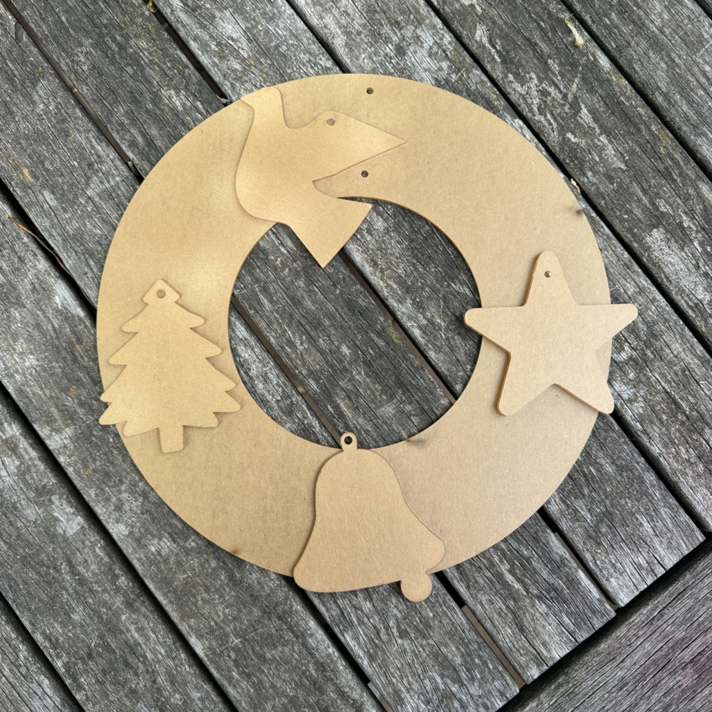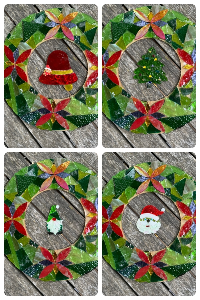 A circular wreath surrounds a Christmas themed piece. Join them with the supplied swivel, and you have a Christmas Sun-catcher, or Door decoration.