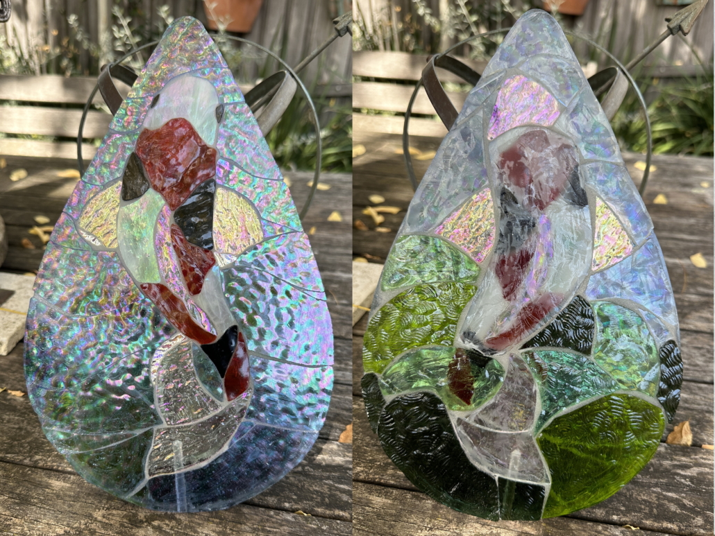 - You can be really creative with these – mosaic on both sides! My Koi drop is mosaiced on both sides, ad I used transparent glass, so you can see the back image from the front. I wanted it to look like a Koi in a Lily pond