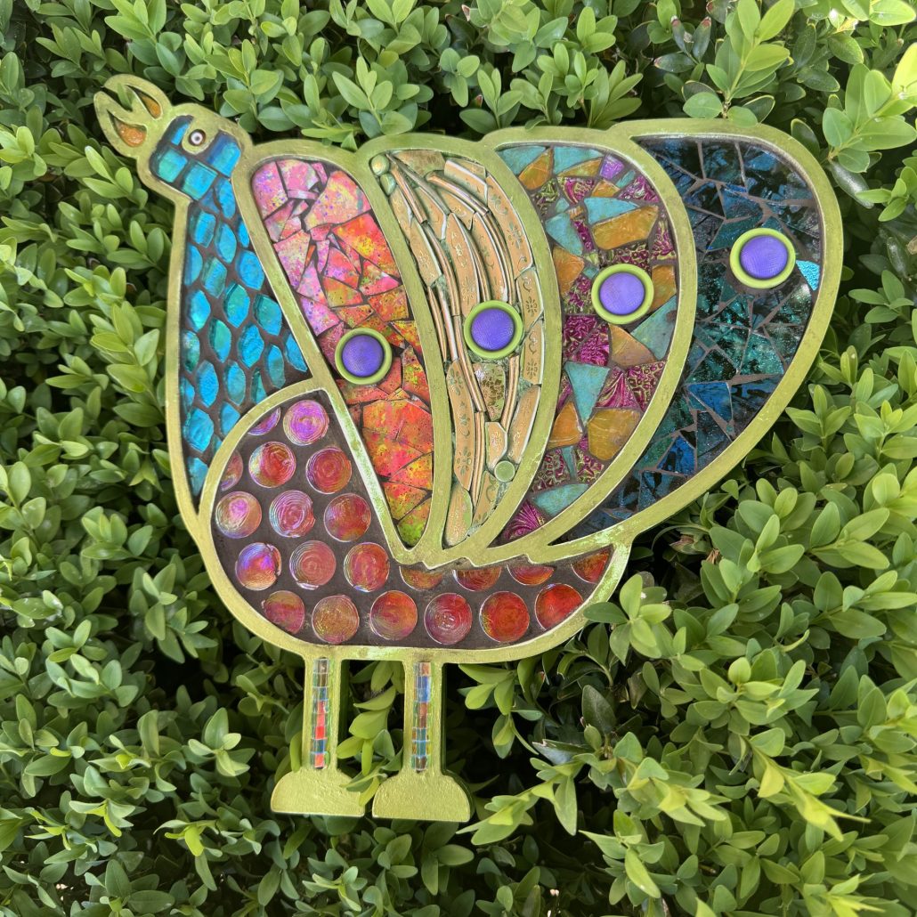 Made in a 3D frame, the piece features buttons, china, glass, glass tile, African Tribal beads, and dichroic laser-cut prisms. Grouted with a warm chocolate cement grout.