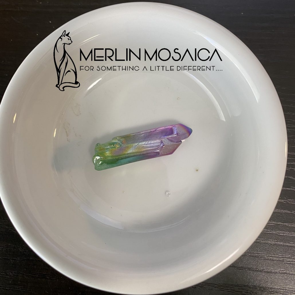 Lemurian quartz in an iridescent green to purple. App. 4 cm in length. Rather Stunning