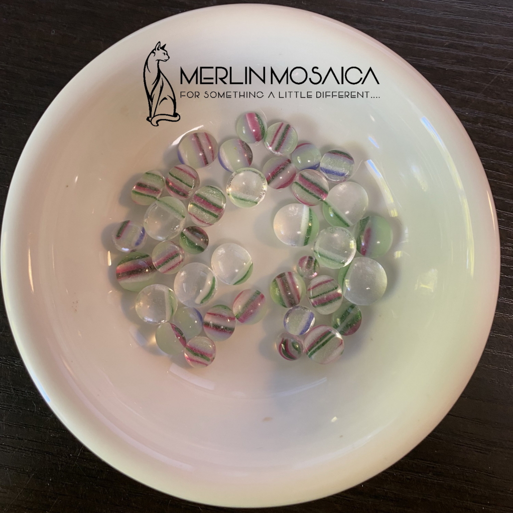 Stunning handmade glass dots – multi-coloured stripes on a clear ground. They remind a little bit of a melted marble, or a humbug lolly! There is a lot of process involved in making these.