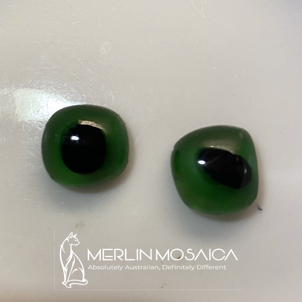 Coloured Glass, with a black pupil. Each piece is slightly different, due to their handmade nature.