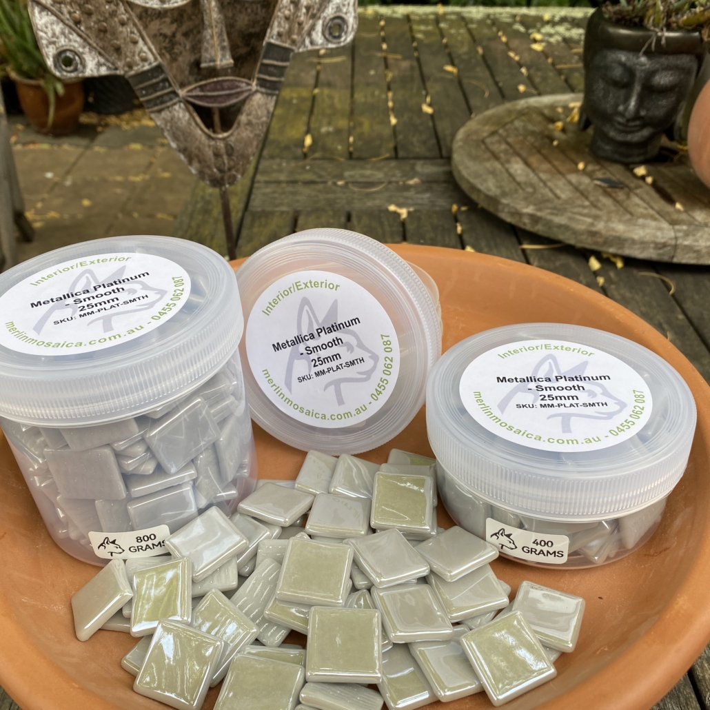 Stunningly luxurious pale silver tile. Not a mirrored or foil tile, nor iridescent, this tile has an undefinable glow. Quite simply one of the most beautiful tiles I have ever seen.  Use as is, or cut them easily with your favourite wheeled nippers. Cut them into strips, diamonds, petals or leaves; or just use whole.