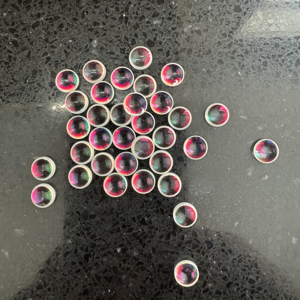 Small rounded dots of clear dichroic glass with a laser machined surface. Quite simply stunning.