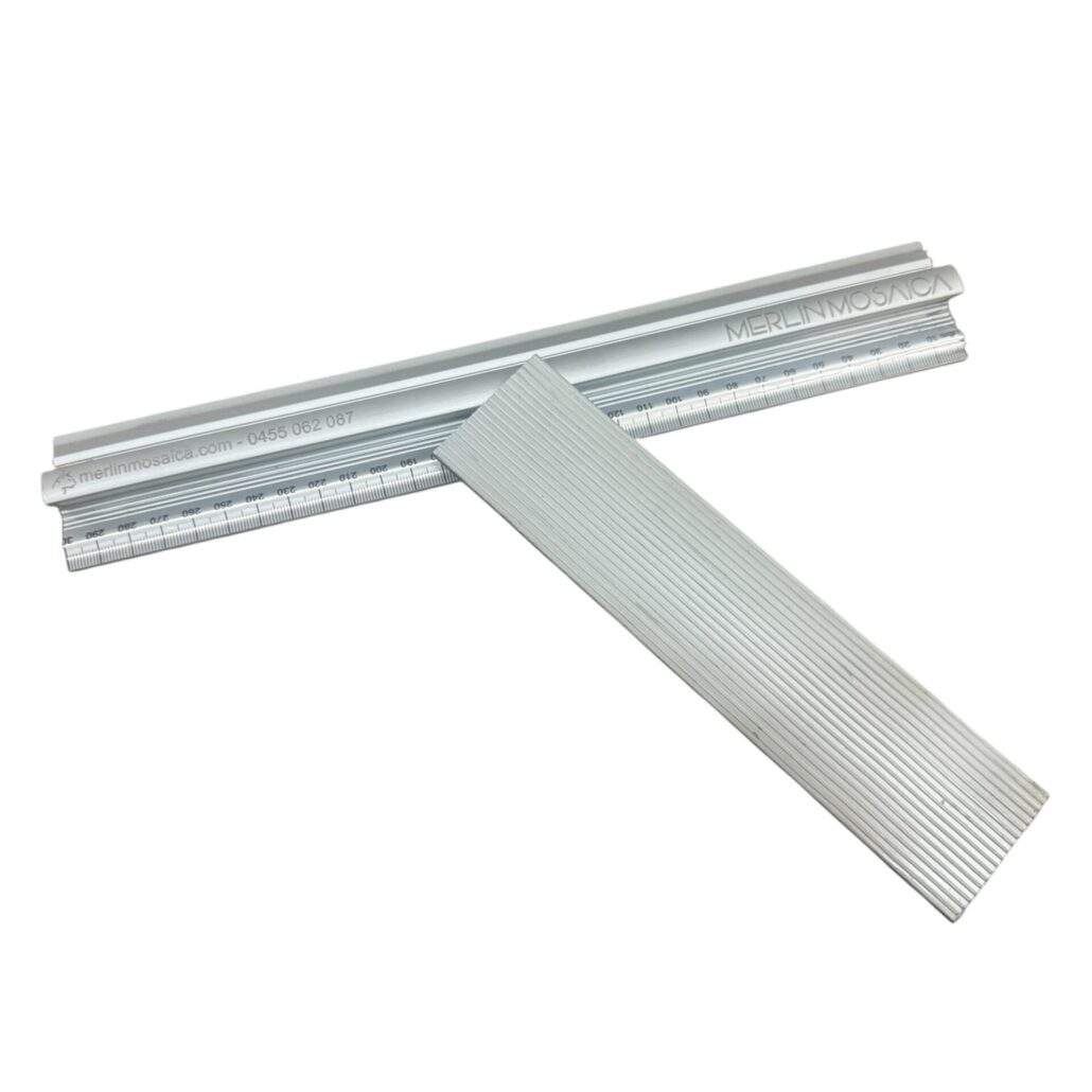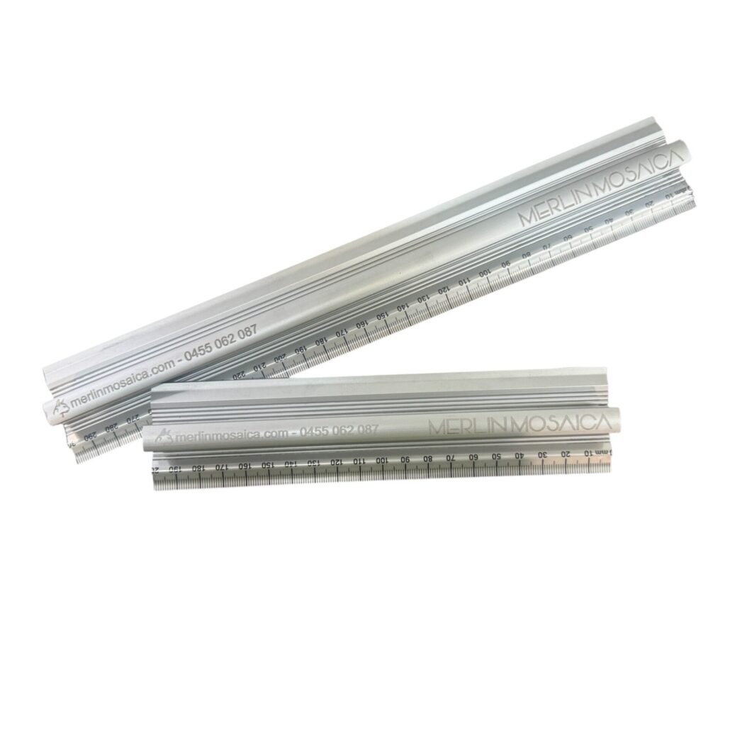 Merlin Mosaica’s solid anodised aluminium safety ruler has a specially designed raised handle for a high level of protection, strategically placed full length grooves for increased grip, full-width non marking silicone rubber base, and clear legible measurement marks.