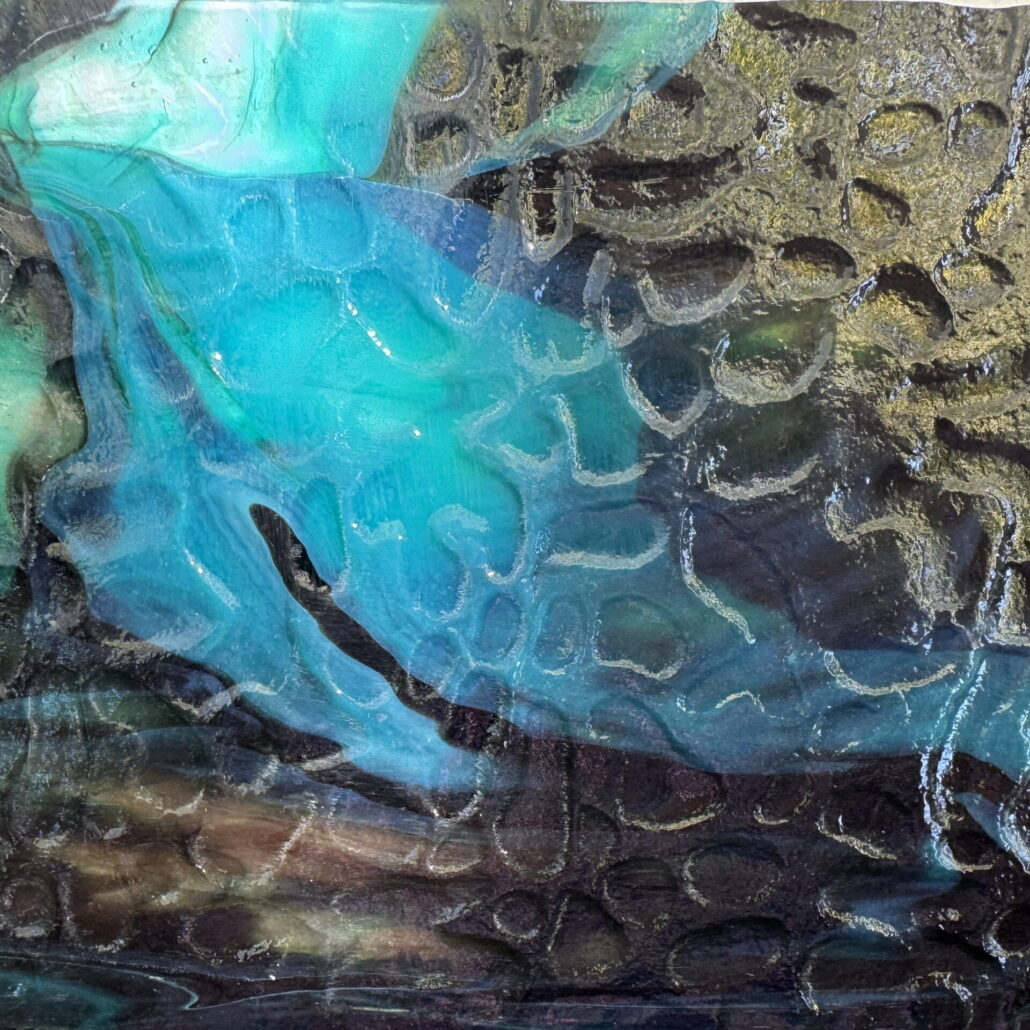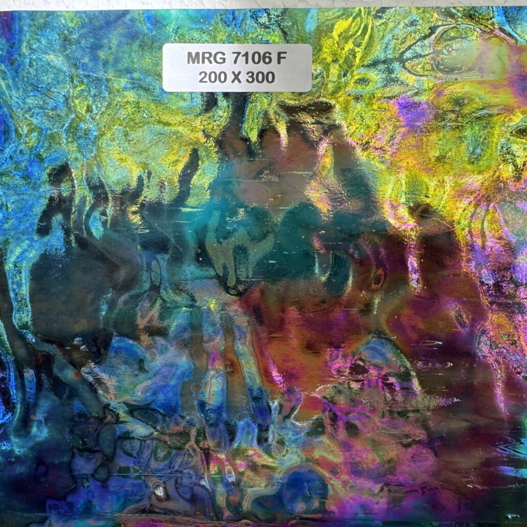 Stunning turquoise, grey and white flemish patterned glass with an iridised face.
